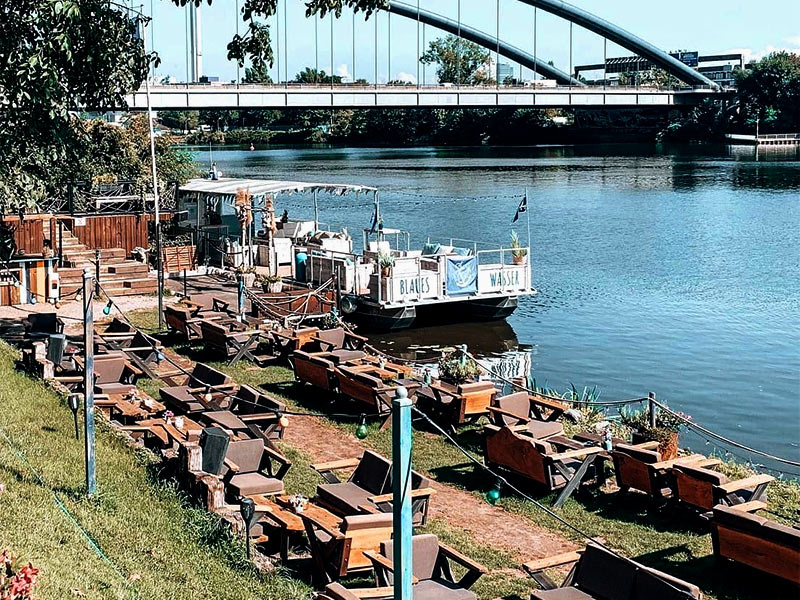 Am Ufer werden Drinks und Snacks (Hummus und verschiedene Flammkuchen) serviert. Uferplätze werden für 3 Stunden vergeben.